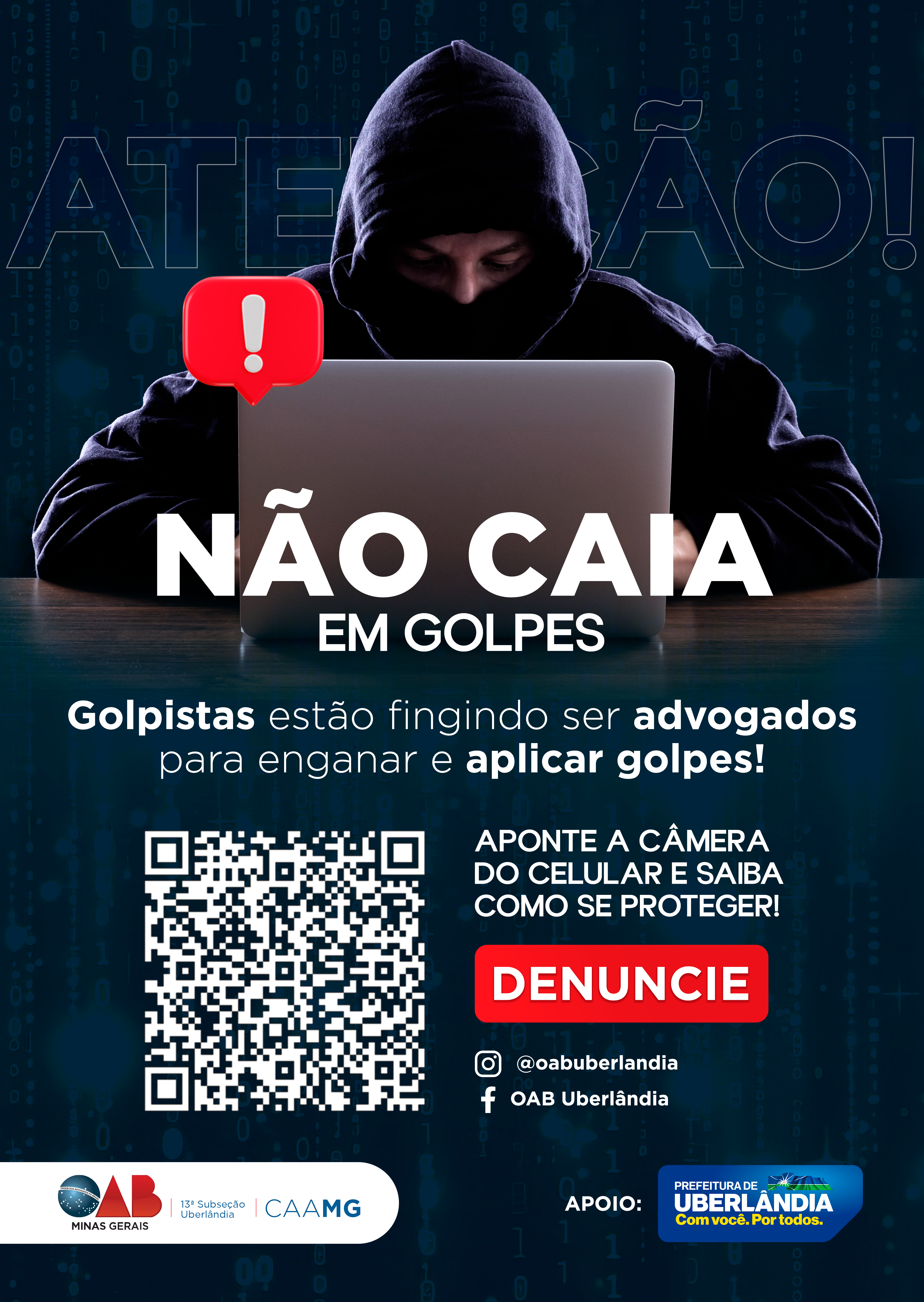 Diante dos diversos relatos de advogados (as), o presidente da OAB Uberlândia Luciano de Salles Monteiro, ressalta que a 13ª Subseção segue com medidas preventivas e reforçando estratégias que visam proteger a todos. "A OAB Uberlândia tem se empenhado para que as campanhas possam chegar à população. Por isso temos trabalhado junto ao Ministério Público, à Procuradoria Geral de Justiça e solicitado à Polícia Civil e Polícia Federal empenho nas investigações dando pistas a eles para que possam chegar aos malfeitores destes golpes. Também fizemos parceria com a Prefeitura de Uberlândia para a divulgação de cartazes dentro dos órgãos públicos e em locais de atendimento à população. Além disso, campanhas no rádio e na televisão têm o intuito de conscientização. Não nos furtaremos de seguir alertando a população deste mal que é a tentativa de quebra da relação de confiança entre advogado e cliente".